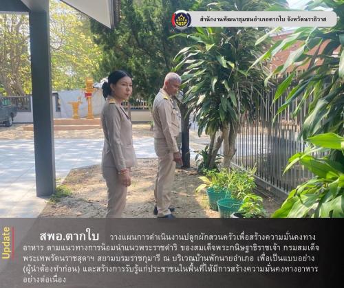 นางสาวณภัสนันทร์ เจริญพันธ์ พัฒนาการอำเภอตากใบ พร้อมด้วยเจ้าหน้าที่พัฒนาชุมชนร่วมกับ นายสุทัศน์ น้อยสร้าง เกษตรอำเภอตากใบ วางแผนการดำเนินงานปลูกผักสวนครัวเพื่อสร้างความมั่นคงทางอาหารตามแนวทางการน้อมนำแนวพระราชดำริ ของสมเด็จพระกนิษฐาธิราชเจ้า กรมสมเด็จพระเทพรัตนราชสุดาฯ สยามบรมราชกุมารี ณ บริเวณบ้านพักนายอำเภอ เพื่อเป็นแบบอย่าง(ผู้นำต้องทำก่อน) และสร้างการรับรู้แก่ประชาชนในพื้นที่ให้มีการสร้างความมั่นคงทางอาหารอย่างต่อเนื่อง